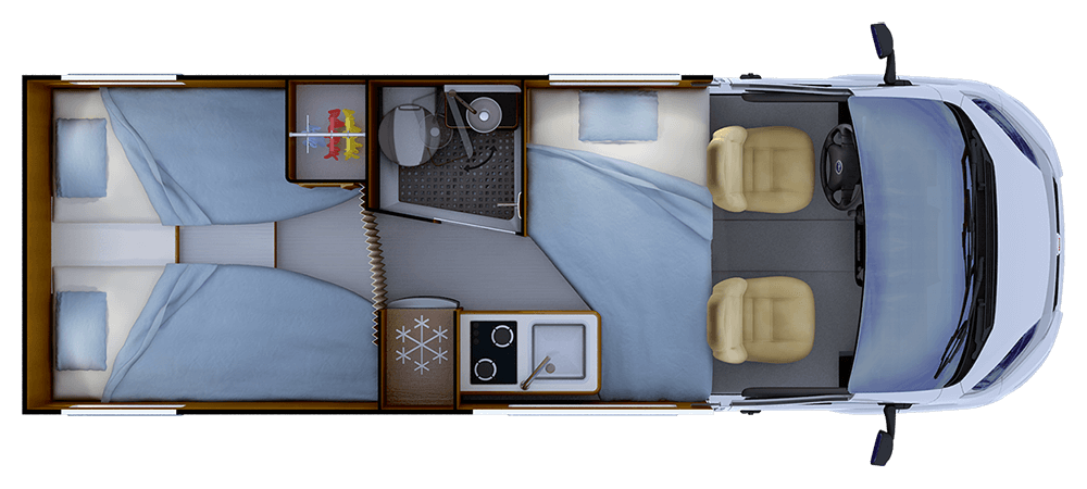 • Finestre laterali e posteriore a doppio vetro con cornice in poliuretano, oscurante e zanzariera integrati